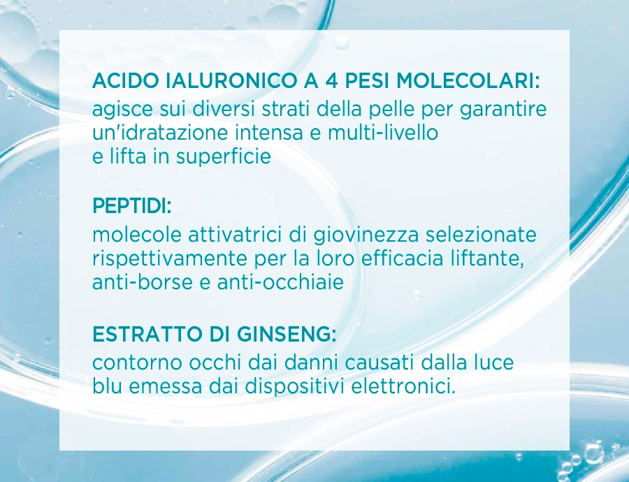 Una combinazione perfetta tra l’acido ialuronico a 4 pesi molecolari e delle nuove molecole attivatrici che stimolano la produzione di nuovo collagene donando alla pelle un effetto lisciante senza precedenti.